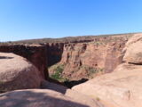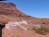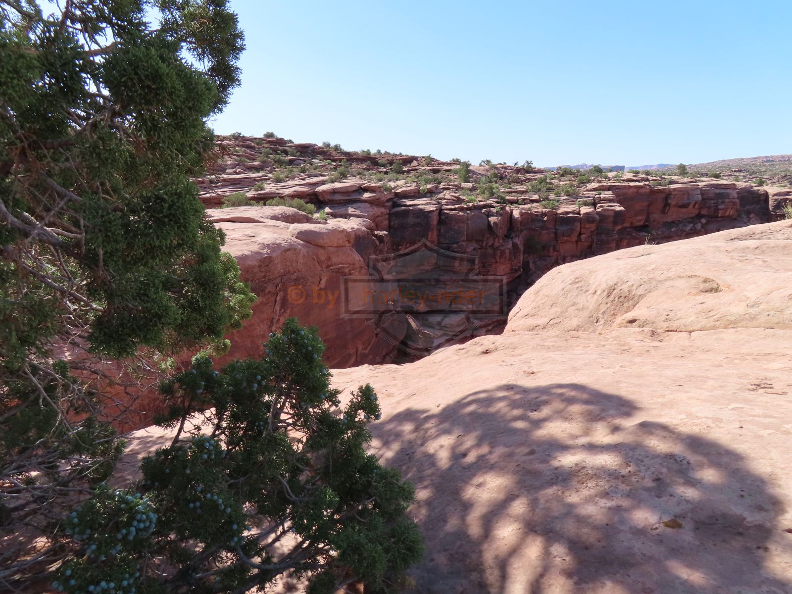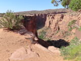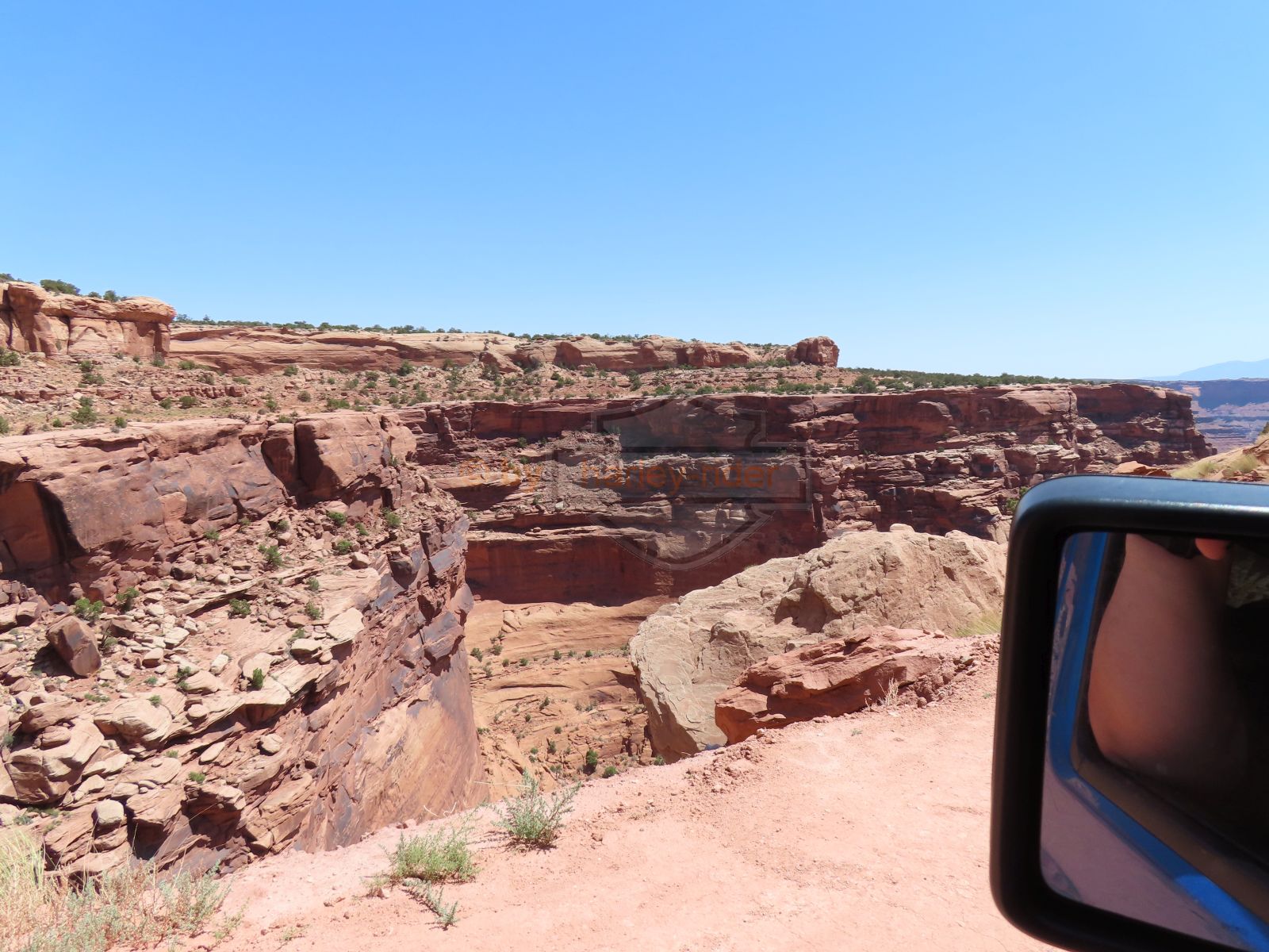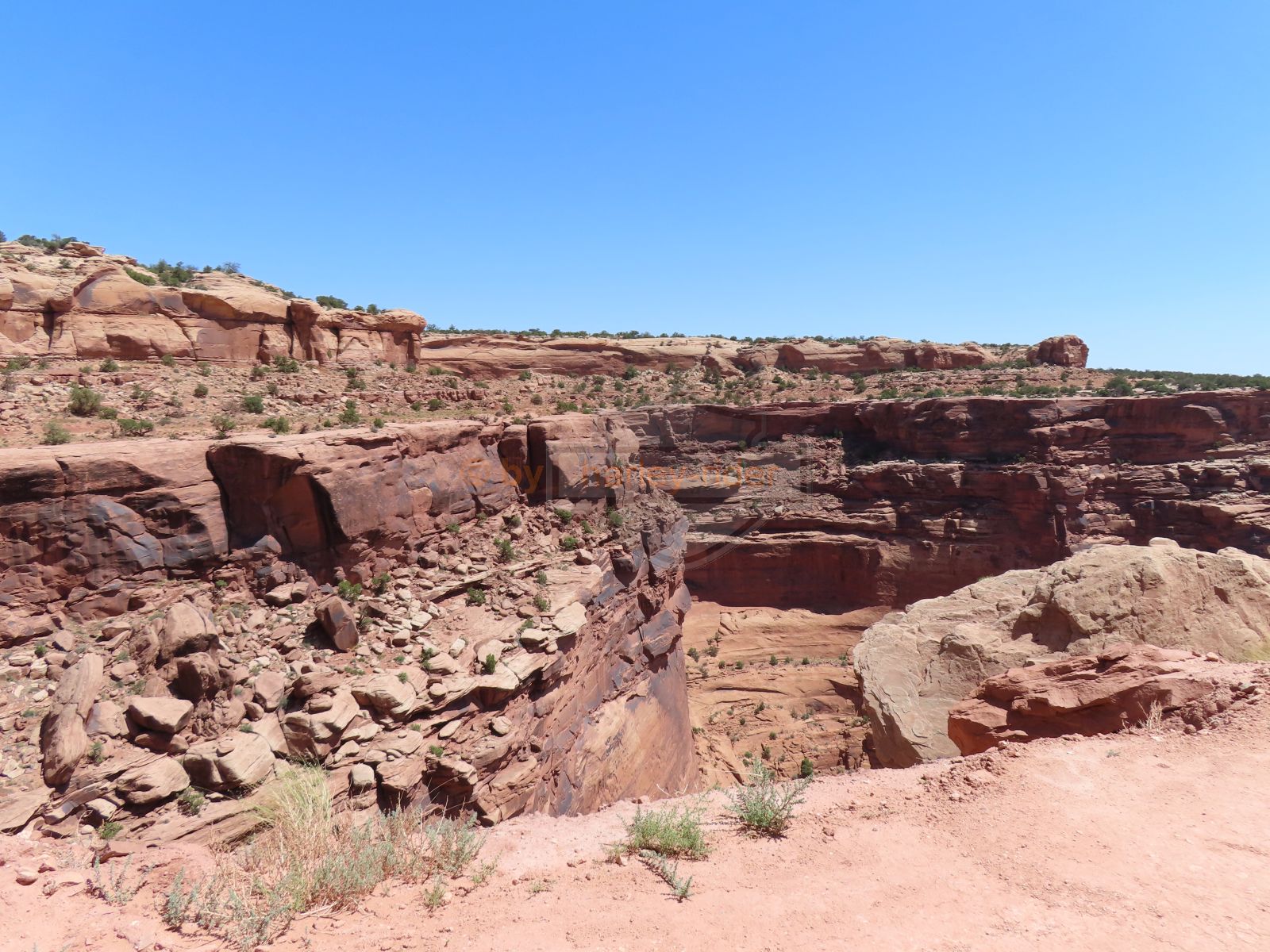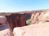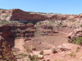 Zuerst aber führte der Gemini Bridges Trail vom UT191 direkt einer Felswand entlang hoch auf eine Hochebene. Vor den Gemini Bridges geht der Bull Canyon Trail links weg und kurz später ist die Abzweigung zum 'Surprise Overlook'. Da fährt man zum Schluss durch ein trockenes bachbett und nach der Ausfahrt und zwei Kurven muss man unvermittelt stoppen, denn man steht am Rand des Day Canyon.