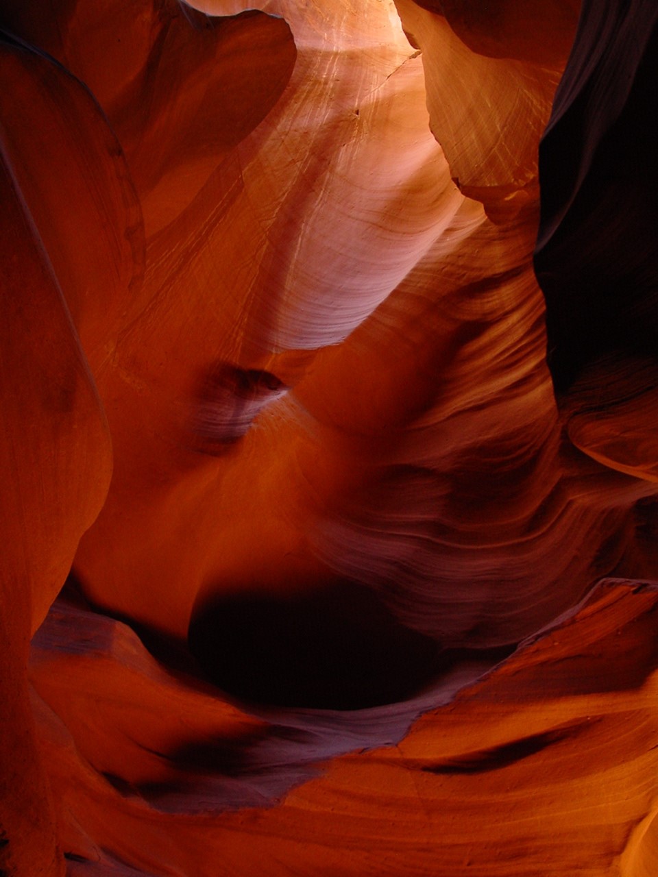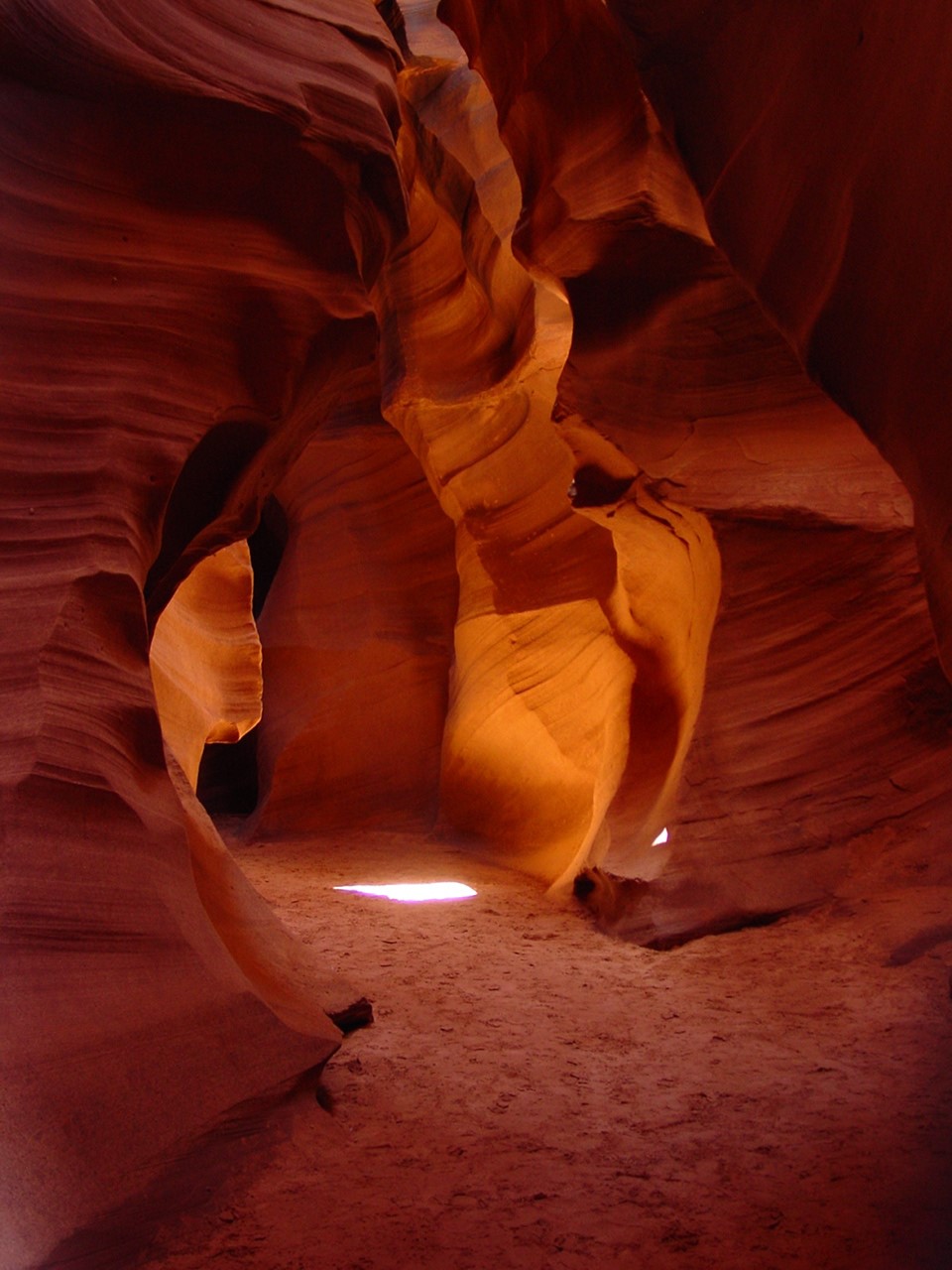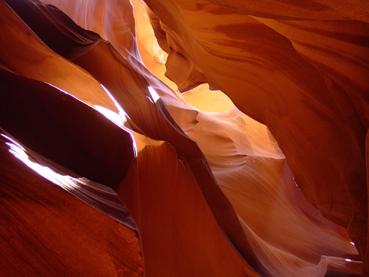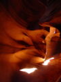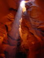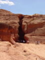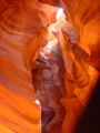 Vor der Weiterfahrt nach Flagstaff, wo wir wieder auf die 'Old Route 66' treffen sollten, besuchten wir noch eine weitere Sehenswürdigkeit der Navajo Indianer, den Antelope Canyon. Diese schmale Schlucht bietet je nach Tageszeit und Sonneneinfall ein Farbenspiel sondergleichen an den Felswänden. Der Canyon ist heute noch im Besitz der Indianer und ein indianisches Kulturgut, dass ihnen nicht von den 'Weissen' gestohlen wurde. Er wurde vor Jahren von einem indianischen Hirtenmädchen entdeckt und dient heute als touristische Einnahmequelle. Die Besichtigung wird zu Fuss gemacht und durch den Canyon hindurch ist es meistens nur gerade Schulterbreit.