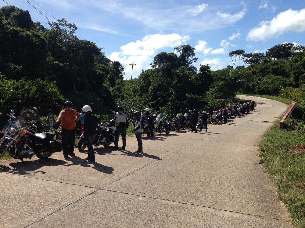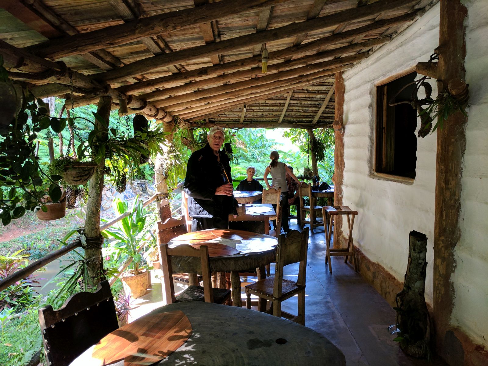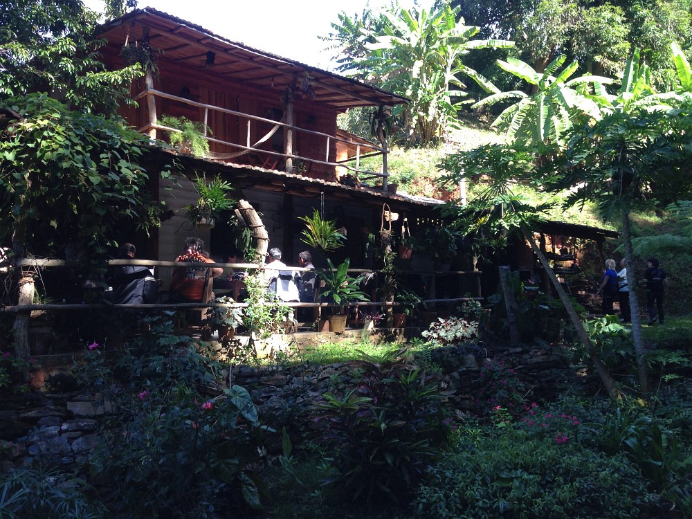 Kurz darauf entdeckte ich ein Restaurantschild, aber kein Gebäude dazu. Nur ein kleiner Parkplatz und daneben ein Tor. Ich machte mich auf die Erkundung was hinter dem Tor liegt und fand im 'Dschungel' ein Haus, das sich als das Restaurant 'El Manantial' inkl. Übernachtungsmöglichkeit herausstellte. Das im Wald gelegene Haus ist ein richtiges Kleinod in dieser Gegend. Wir bekamen da frischen Limonensaft und Kaffee. Schon bald traf Klaus mit den restlichen Teilnehmern ein und auch sie verpflegten sich hier.
