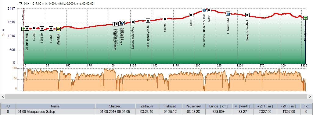 Von hier bis Gallup gibt es verschieden Besichtigungsmöglichkeiten, Acoma Pueblo, Ice Caves, Bandero Vulcan, El Morro National Monument und Anderes mehr. Klaus entschloss sich hier die 66 südlich zu verlassen und die Ice Caves, den Vulcan und das National Monument zu besuchen.