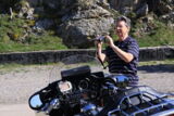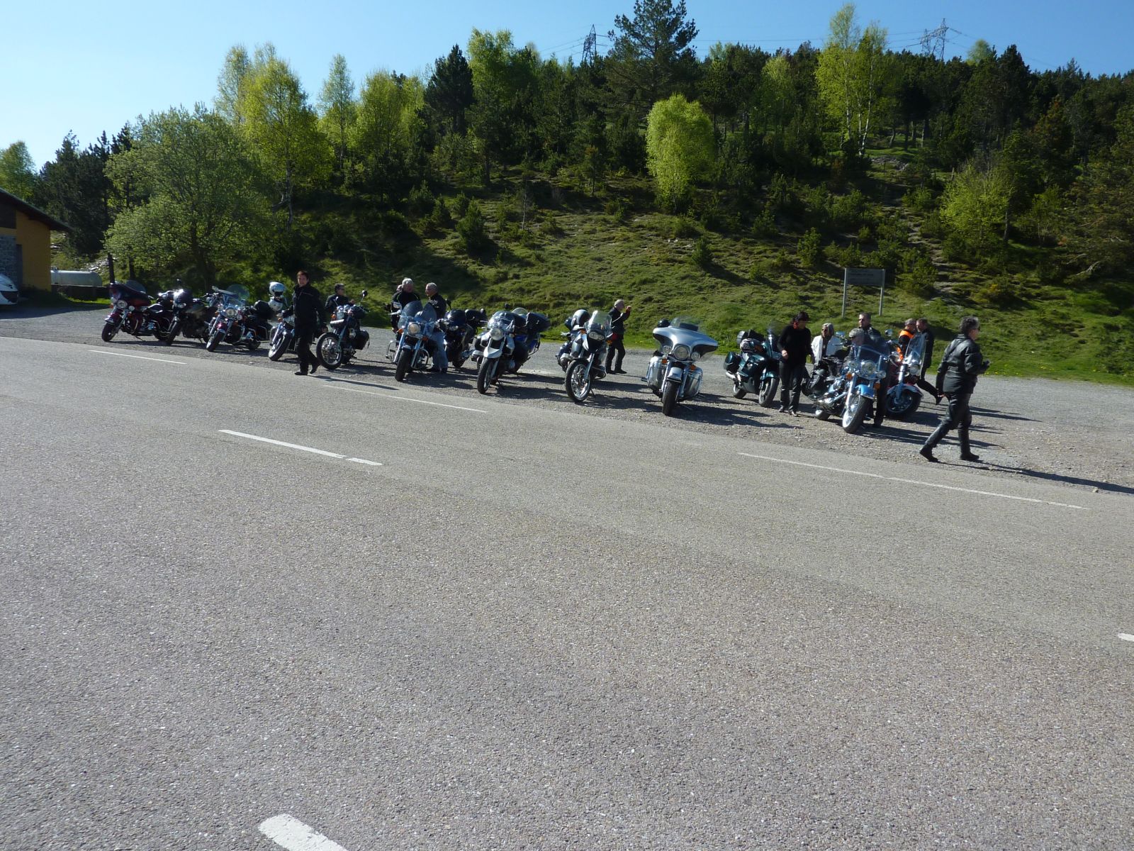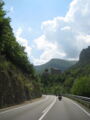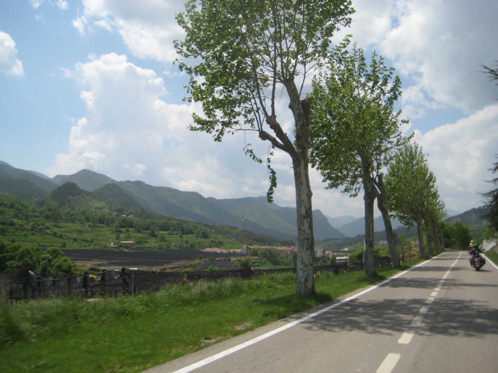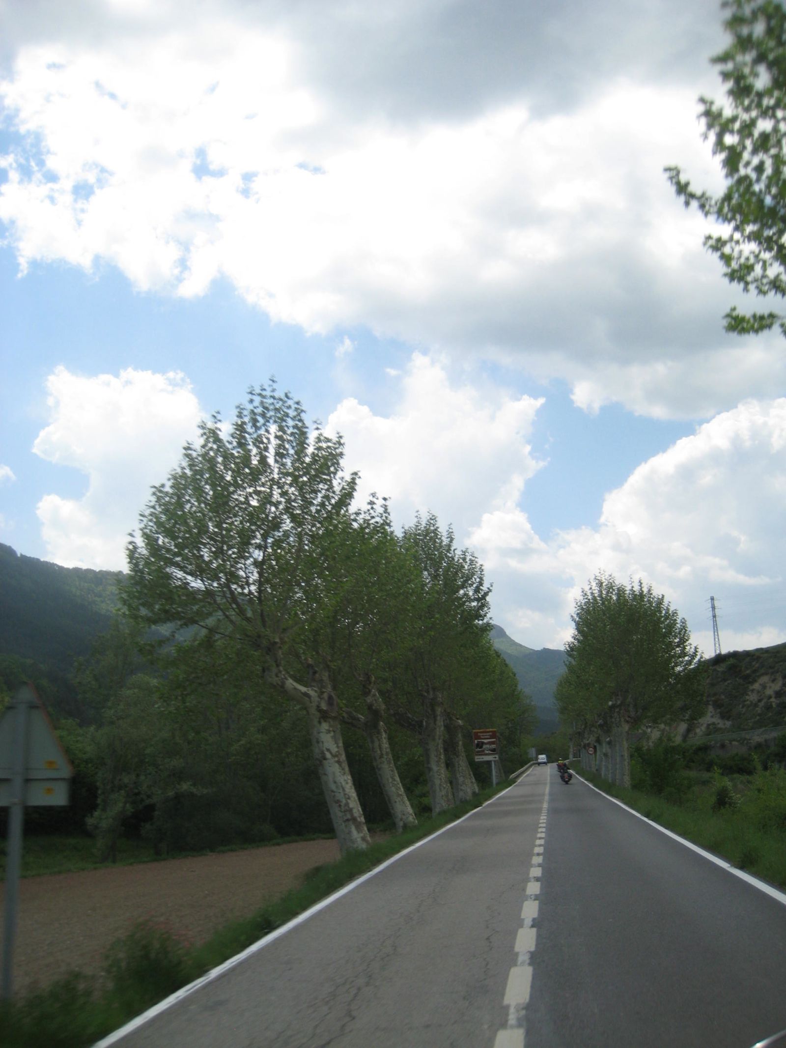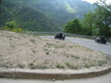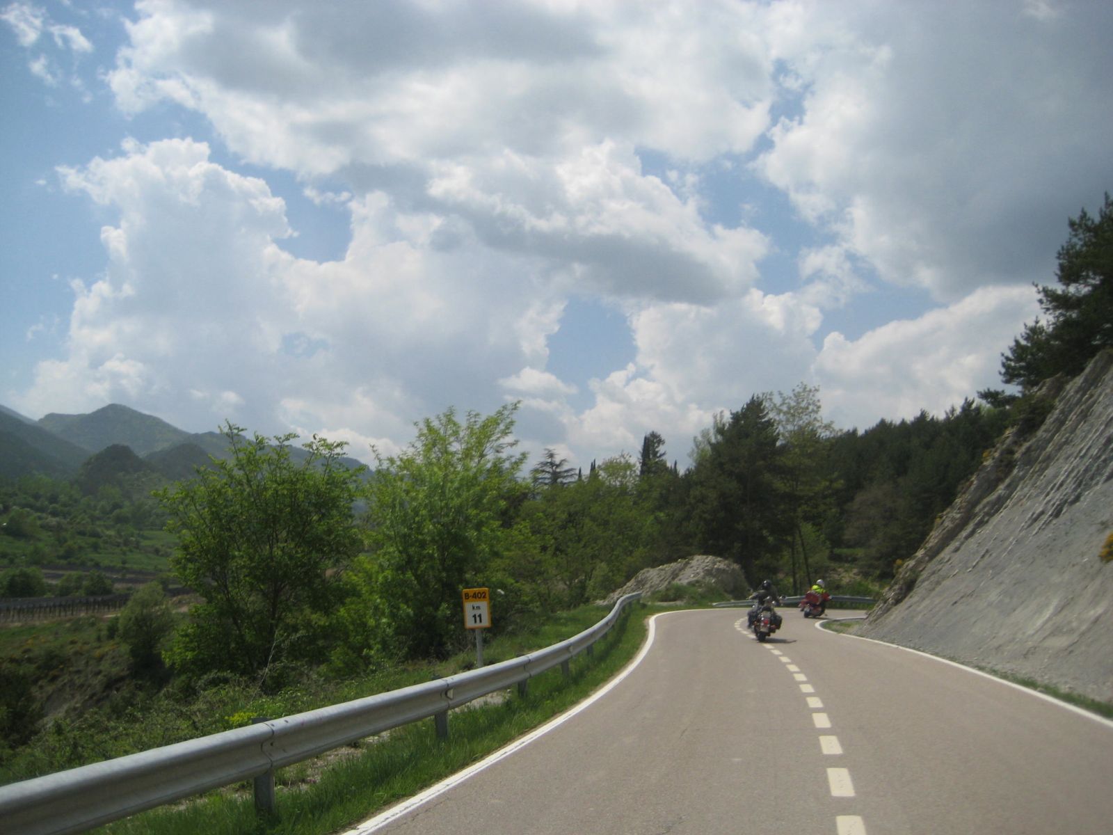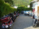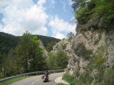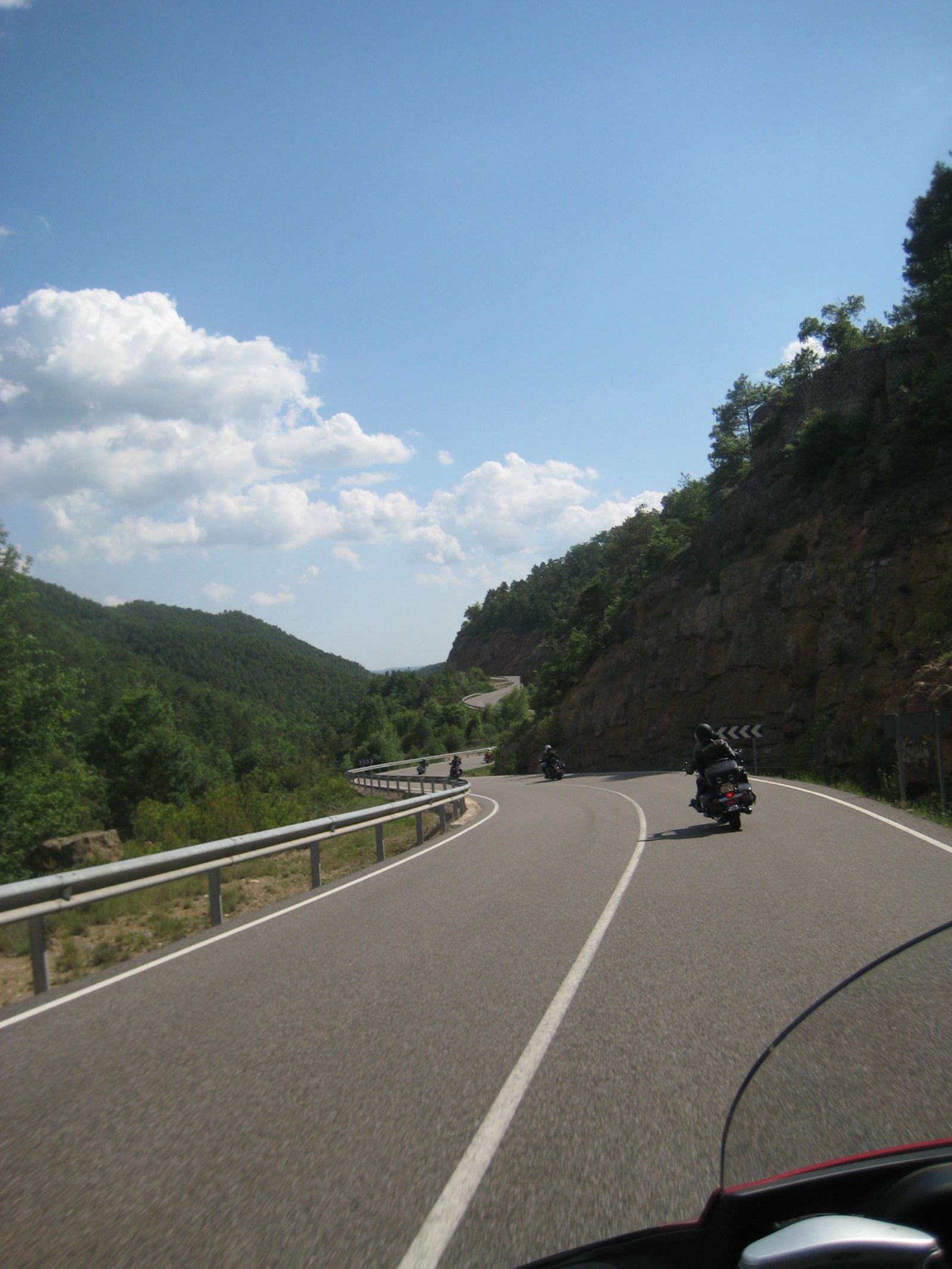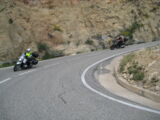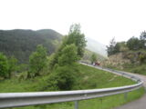 Nach der Pause ging die Fahrt weiter nach Olot. Ich verpasste da die Abzweigung um über den Coll de Capascosta zu fahren und bevor ich dies noch korrigieren konnte befanden wir uns bereits im Verbindungstunnel nach Olot. Nach rund 2 Kilometer Tunnelfahrt kamen wieder an die frische Luft und nach Olot. Von hier aus fuhren wir wieder westwärts über den Coll de Cubet und Coll de Canes nach Ripoll. Die Strecke war so wunderschön kurvig und man konnte sie zügig fahren dass wir da recht gut vorankamen. Mit mehr als 20 Motorrädern hintendran hatte ich auch nie den Blick zurück bis zum Schluss. Da es aber auch keine grossen Abzweigungen unterwegs gab, ging ich davon aus, dass Alle nachkamen. Bei der Ortseinfahrt von Ripoll hielten wir auf einem Platz neben der Strasse an und warteten bis Alle aufschlossen. Doch es kamen nicht alle, Kari und ein paar weitere Bikes so wie der Bus fehlten. Da bemerkte einer dass ein Motorrad unterwegs an eine Tankstelle gefahren sei und dann nicht mehr nachgekommen ist. Soviel zu der Frage am Morgen ob alle genügend Benzin dabei haben, resp. der Verhaltensregel 'auf den hinten nach fahrenden achten und diesen nicht verlieren' ...