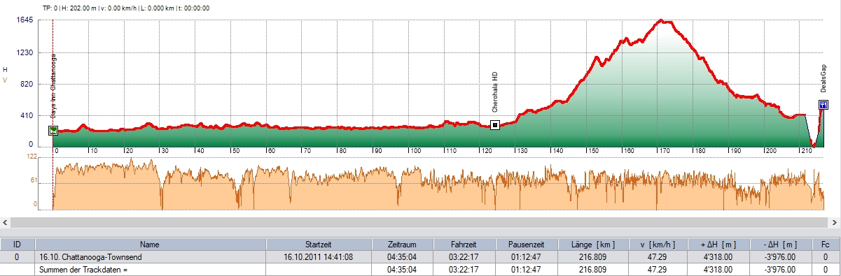 Heute steht mit Sicherheit die Attraktion für Motorradfahrer schlechthin auf dem Programm. Nach einer sich im Anspruch steigernden Fahrtstrecke über kurvenreiche Strassen erreicht Ihr „the Gap oder den Schwanz des Drachen“. Die Strecke hat auf einer Länge von 17,6 Km insgesamt 318 Kurven. Die Scharen von Motorradfahrern, die hierdurch angelockt werden, sprechen für sich. Ebenso der Baum der Schande, an dem die diversen Motorradteile derjenigen, die es übertrieben haben zu finden sind. Seid gewarnt, der Drache beisst zu und erwischt immer die all zu leichtsinnigen. Wir verbringen hier unsere Mittagspause und Ihr könnt den Shop besuchen. Schaut Euch dort auch ruhig mal die Bilderwand an und besorgt euch den ultimativen Beweis, in Form einen kleinen Aufklebers für den Helm, dass Ihr es auch getan habt, anschliessend geht es die 11 Meilen den Berg runter. Am Nachmittag fahrt Ihr über den Foothill Parkway am Fusse der Great Smoky Mountains, bis zu Eurem heutigen Etappenziel. Übernachtung im Raum Townsend/Gatlinburg.
