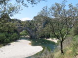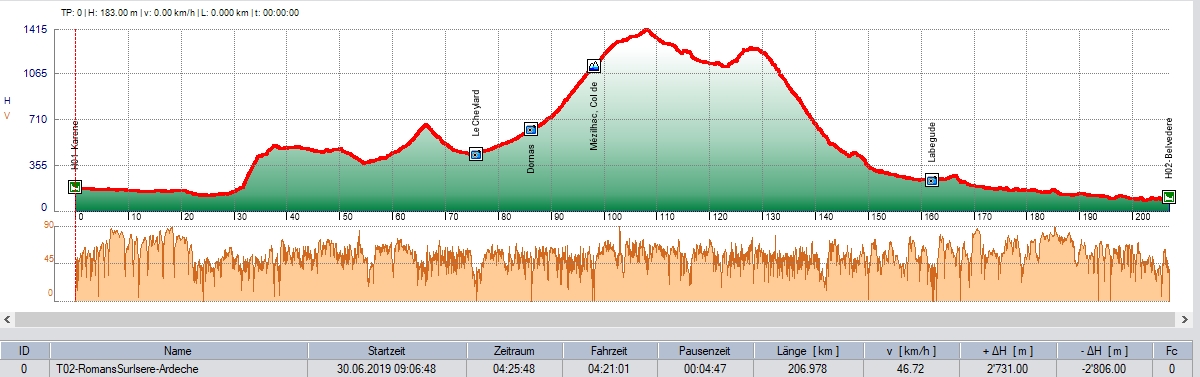 So fuhr ich erstmal westwärts in die Hügel und Pässe der Ardeche hinein und fand da schöne einsame kurvige Strassen. Doch es wurde immer heisser und heisser, so dass ich mich bei Aubenas entschied auf eine witere Runde über noch 6 Pässe zu verzichten und direkt in Hotel Belvedere in der Ardechschlucht fuhr.